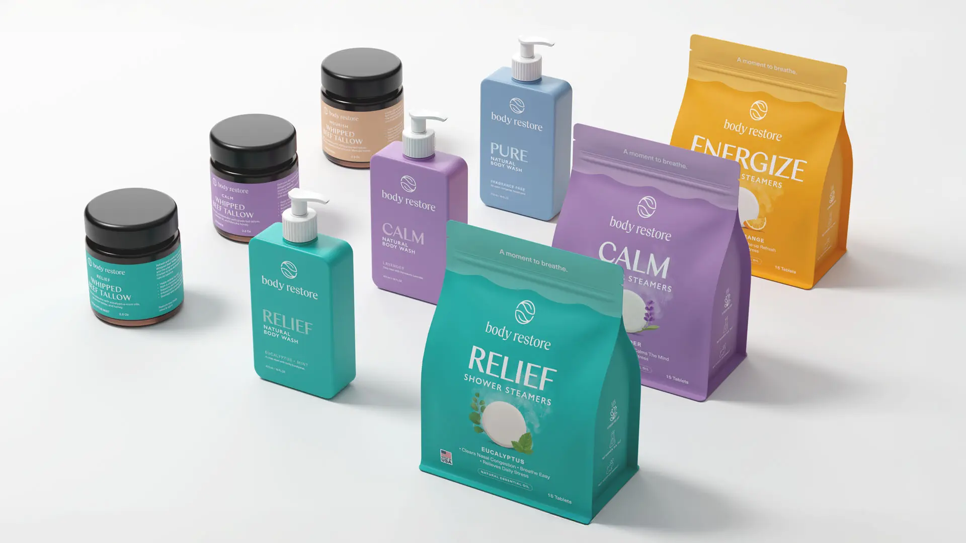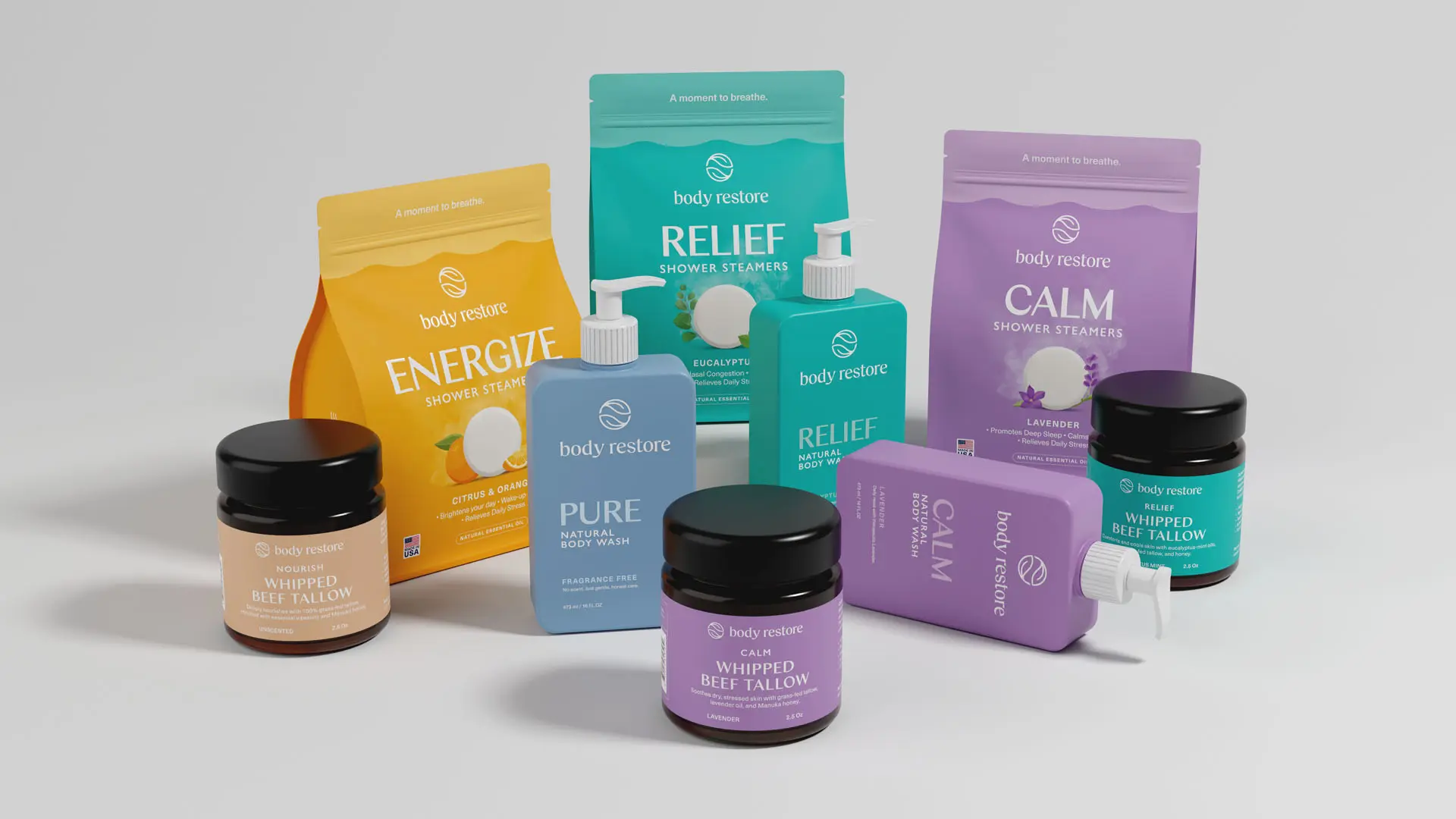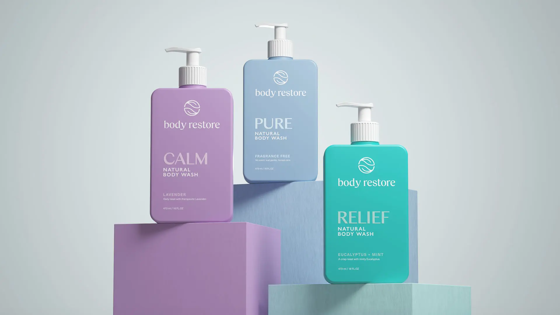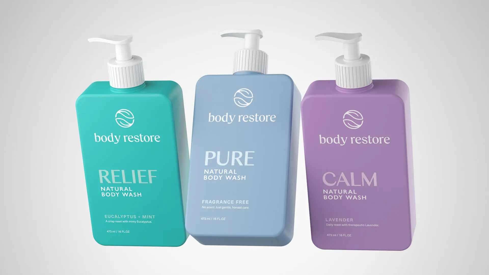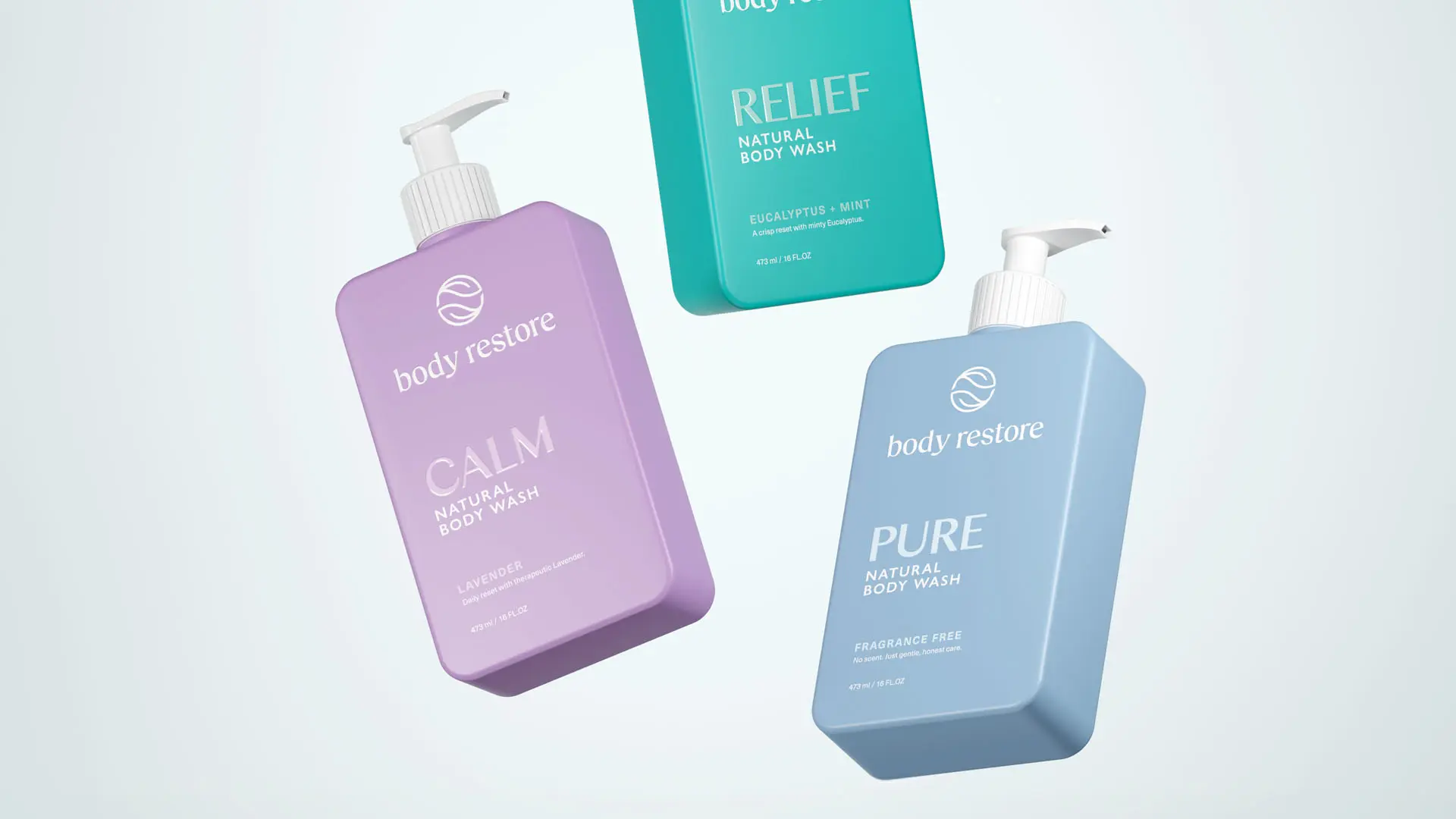 Color played a central role in driving recognition. We developed a scent-led color strategy to guide visual navigation across product lines while establishing distinct identities for each variant. The system allows for flexibility but remains unmistakably Body Restore.