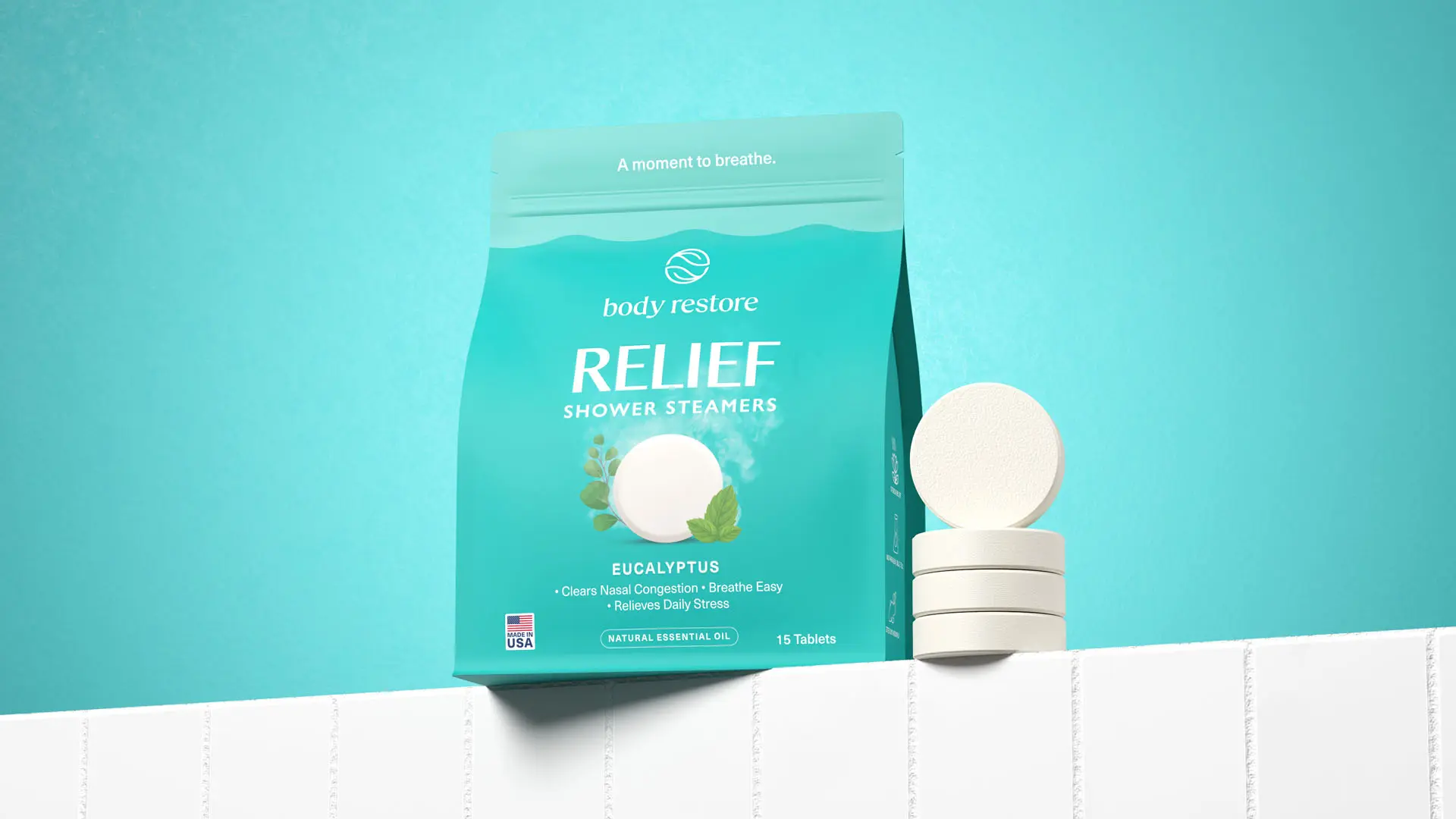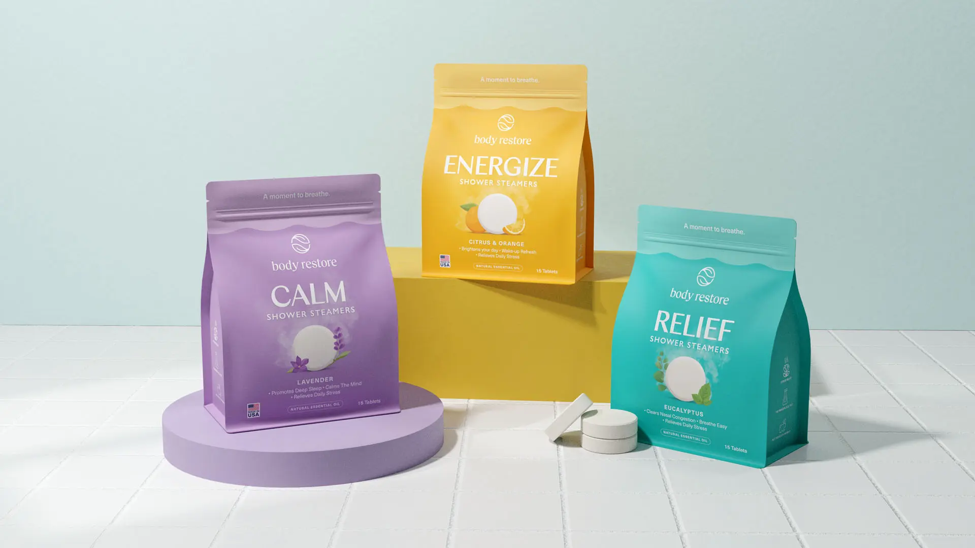 We removed the generic symbol and introduced a new visual language. The real tablet form was combined with aroma-specific botanical elements like eucalyptus sprigs or citrus slices to build a direct sensory connection. This move restored brand recognition and gave each variant an ownable identity based on scent and function. Breathe. Calm. Energize.